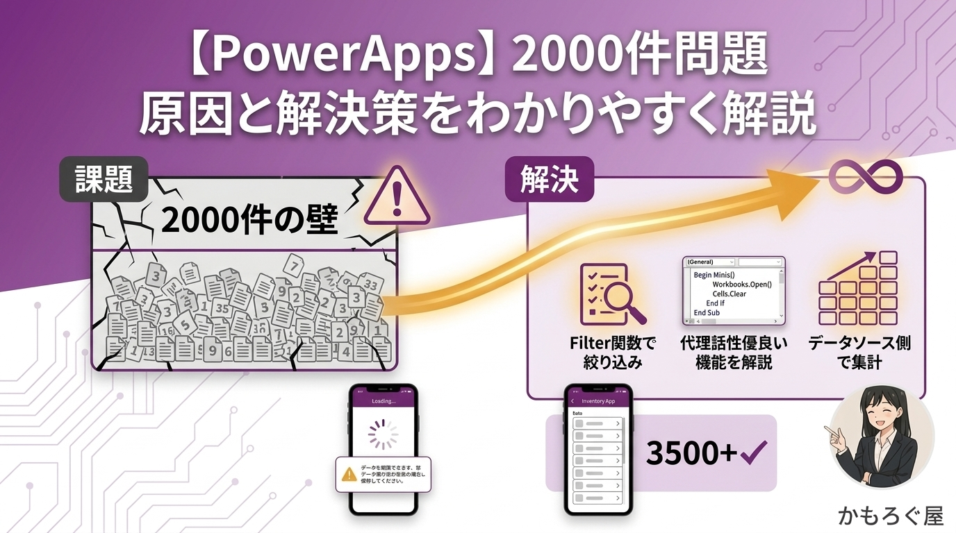 PowerAppsはクラウド上で動作するため、クライアント側に大量データを直接読み込むとパフォーマンス低下やタイムアウトの原因になります。